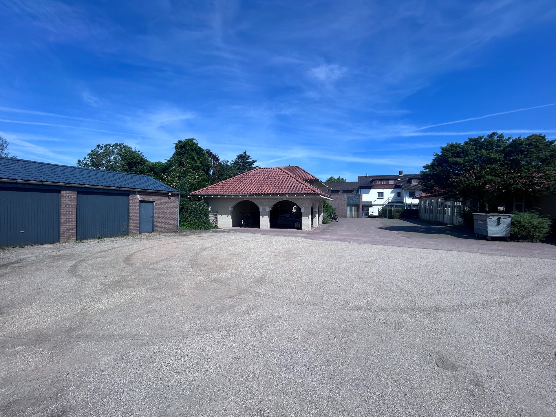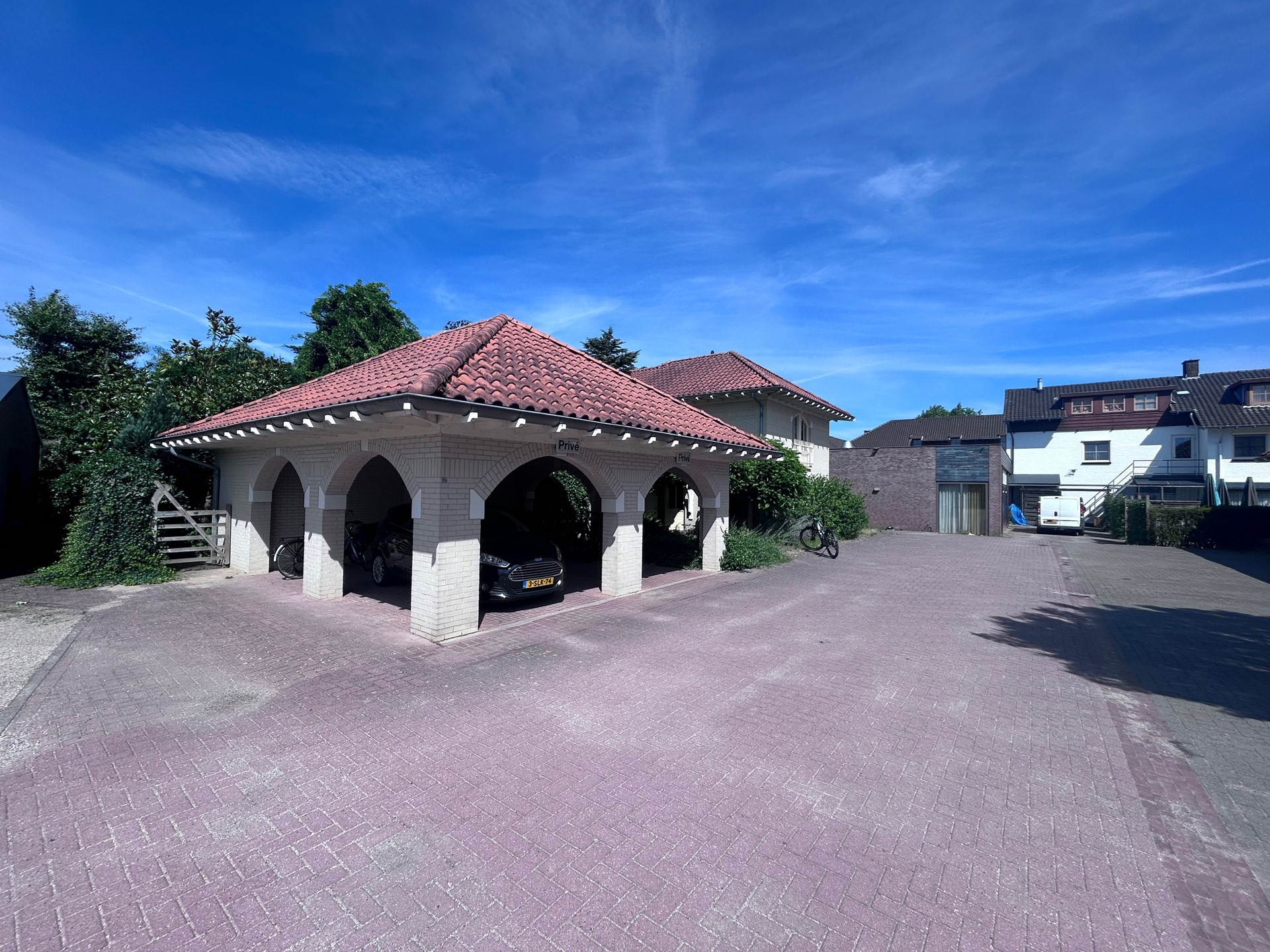 Aan de achterzijde van het perceel staat een dubbele stenen carport in bijpassende stijl met daaraan gekoppeld twee separate bergingen – ideaal voor fietsen, tuinmeubilair en opslag.